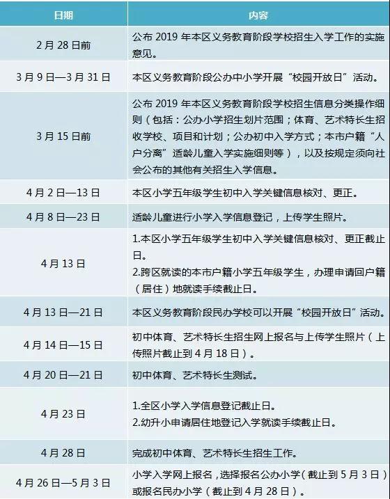 3.招收体育、艺术特长生的相关学校,应通过学校网站公布招生简章,明确招收项目、计划、招生办法等。拟录取的体育、艺术特长生名单须在“上海市义务教育入学报名系统”公示。体育、艺术特长生4月20日完成测试,特长生招生工作于4月28日完成。