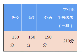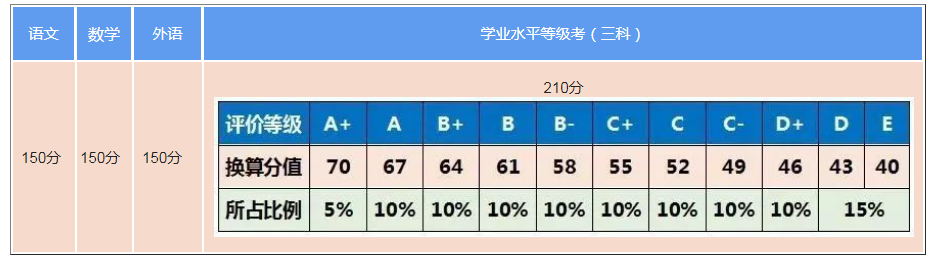 其中,语文、数学、外语每门满分150分;普通高中学业水平等级考每门满分70分,成绩将按照等第呈现,具体见下图:
