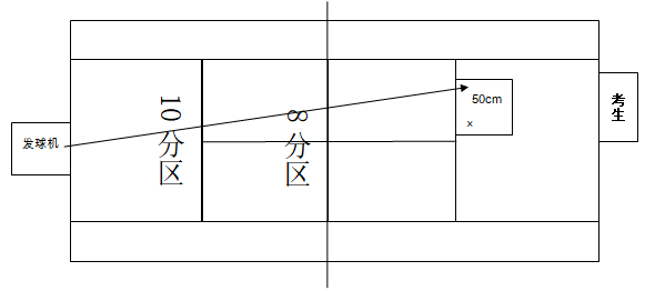 1.考试开始,由乒乓球发球机定点向考生正、反手位连续交替供球30个,频率为40个球(±1)/分钟;球过网上缘8厘米左右高度,供球到考生球台左、右两侧1/3区域内的中线附近区间内(距球台端线约30-55厘米)。考生运用乒乓球正反手技术动作在全台区域内一正一反连续击球,应击中对面台面。