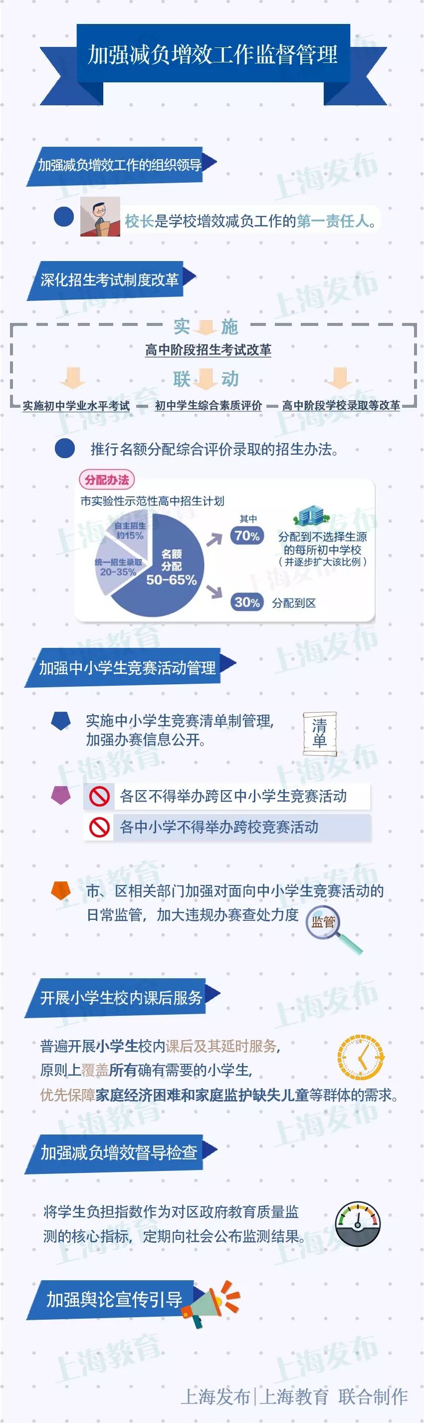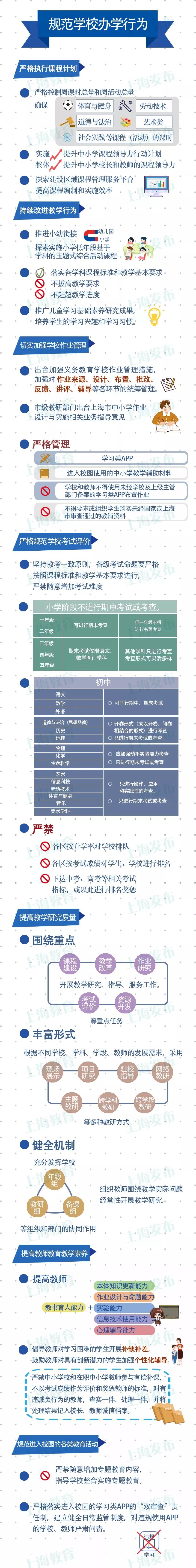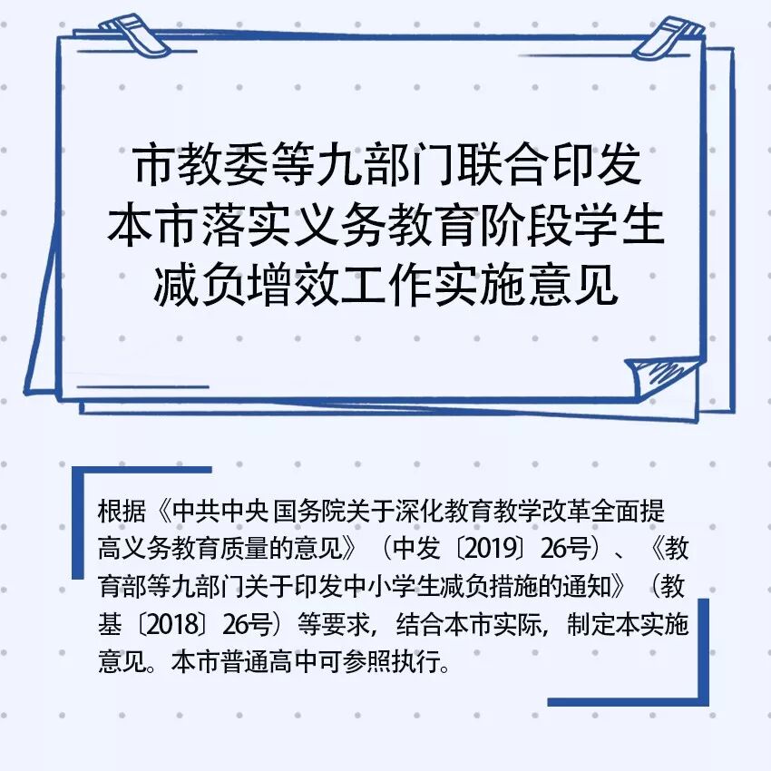 市教委牵头出台的《本市落实义务教育阶段学生减负增效工作实施意见》今天正式公布!《实施意见》强调从学校管理、教学研究、教师专业素质、作业管理、家庭教育指导等方面,通过增强教育教学效益实现减轻学生过重的、不合理的课业负担;强调从优化课程、提高质量、规范校外培训机构、科学评价考试、家庭社会协同五个方面进行综合减负?!妒凳┮饧方?019学年新学期开始施行。