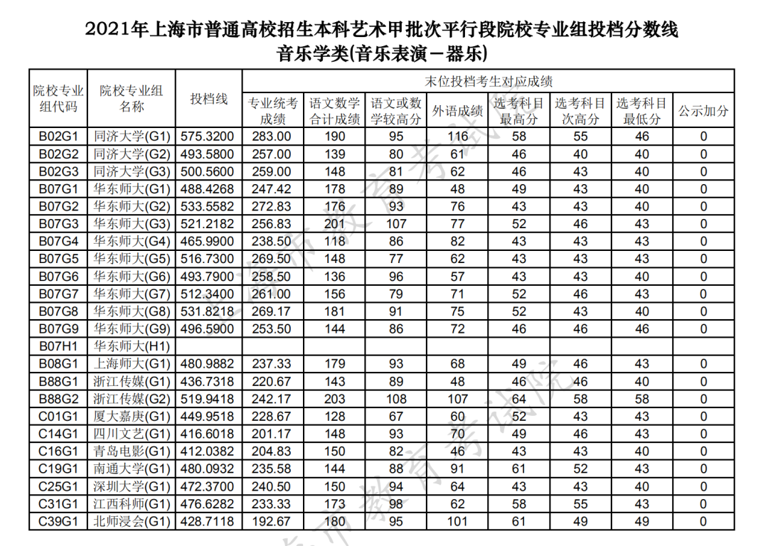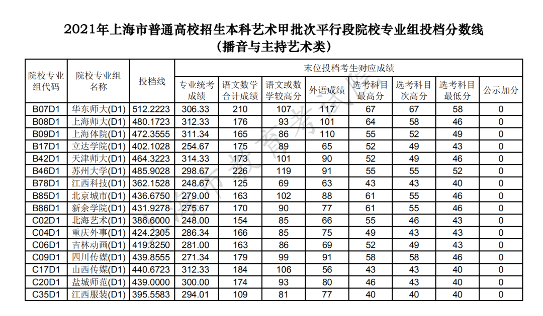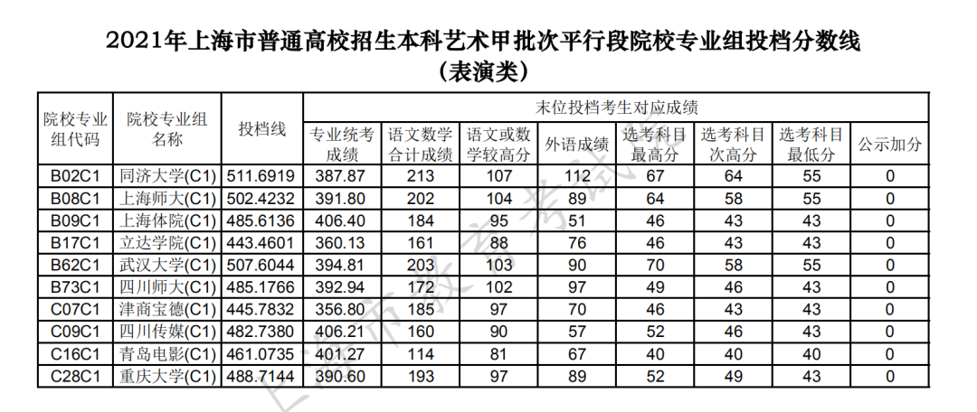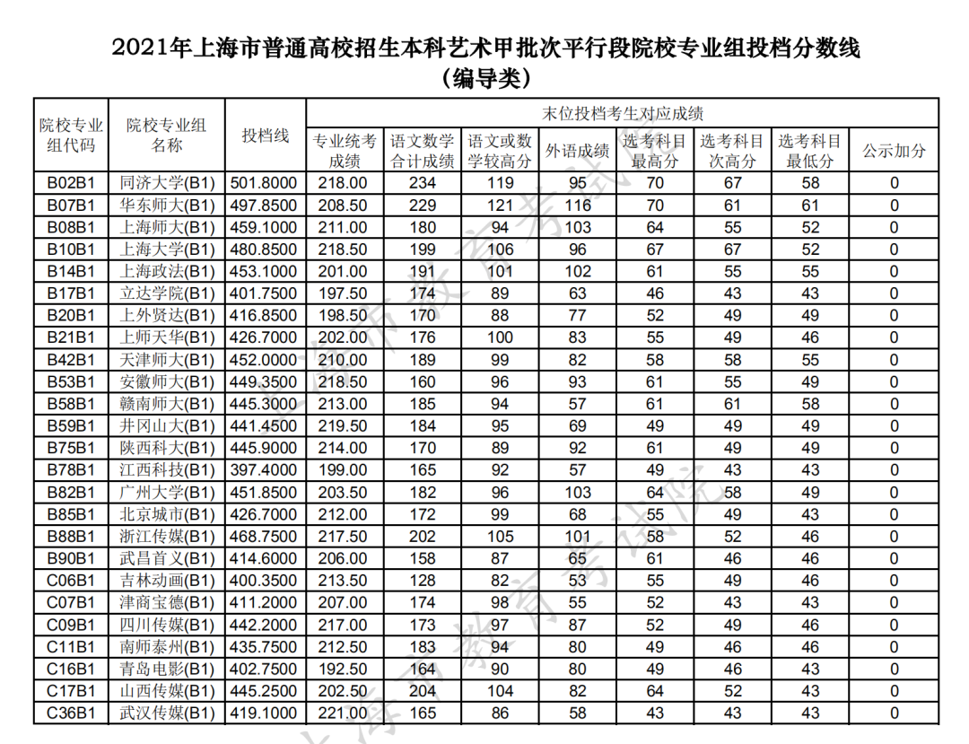 2021年上海市普通高校招生本科艺术、体育甲批次平行段院校专业组投档线
